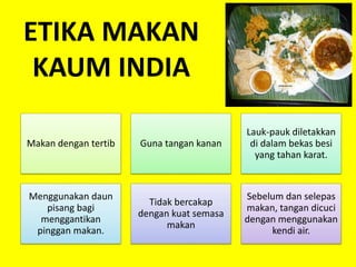PENGENALAN Malaysia merupakan satu masyarakat majmuk yang terdiri dari pelbagai 3 kumpulan etnik iaitu kaum Melayu Cina India Iban Melanau Kadazan Bajau Murut. Pakaian Tradisional India Ketika dikupas satu per satu India memang merupakan negara yang beragam dan memiliki kebiasaan yang tampaknya tidak pernah habis untuk dibahas. KAUM INDIA ADAT RESAM KAUM INDIA Kumpulan etnik terkecil antara tiga kumpulan etnik utama di negara ini kaum India merangkumi 10 peratus populasi.