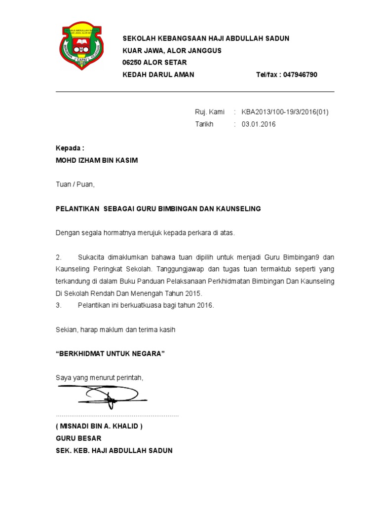 contoh surat perlantikan jawatan tugas sekolah